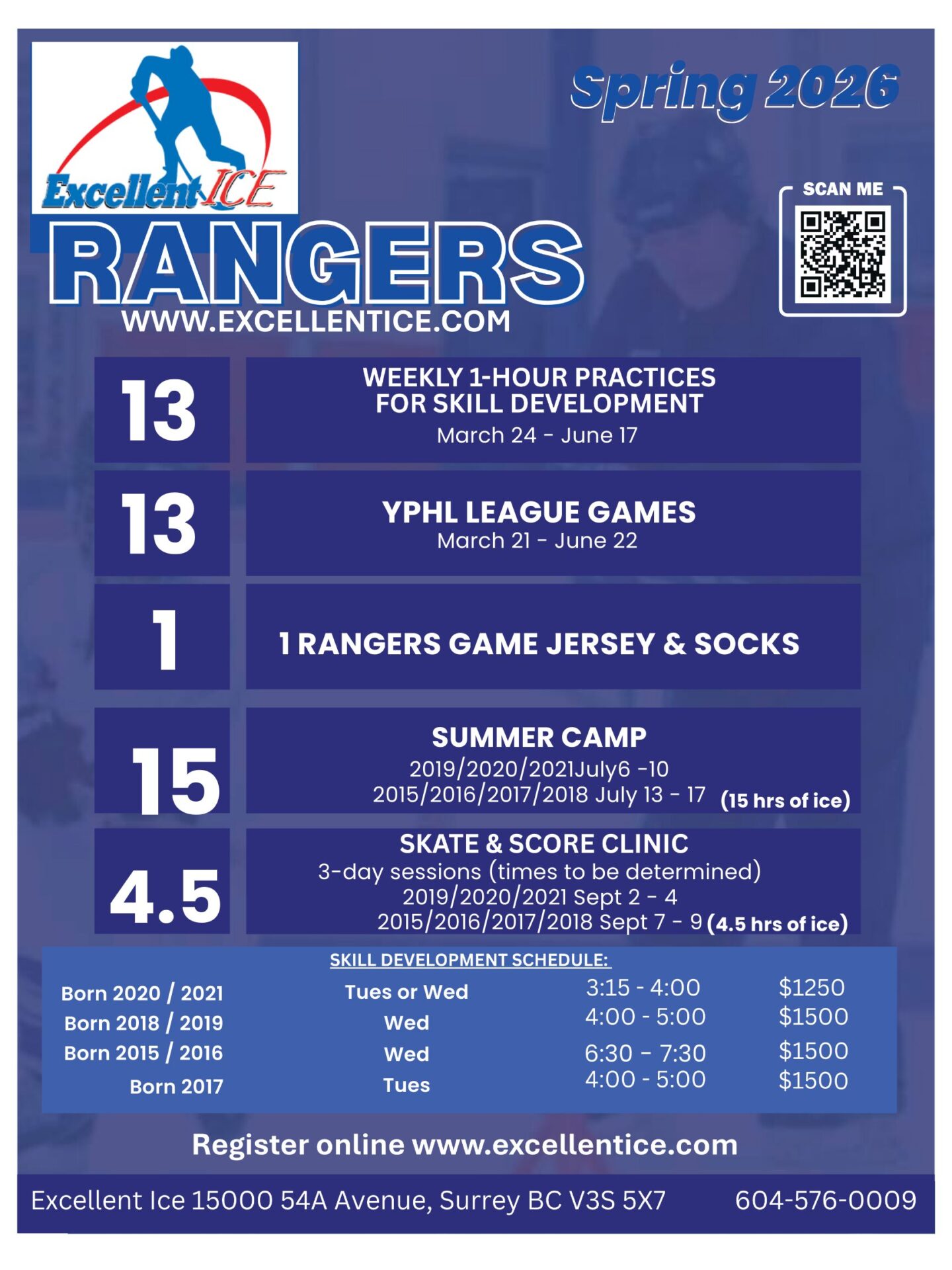 Give your child the edge this spring with the Excellent Ice Rangers Spring Program. Players receive 13 weekly 1-hour skill development practices and 13 YPHL league games running March through June, plus a Rangers game jersey and socks. The program also includes summer development opportunities like our Summer Camp and Skate & Score Clinic. With structured training, league play, and expert coaching, this is one of Surrey’s premier spring hockey development experiences. Register online now to secure your spot.