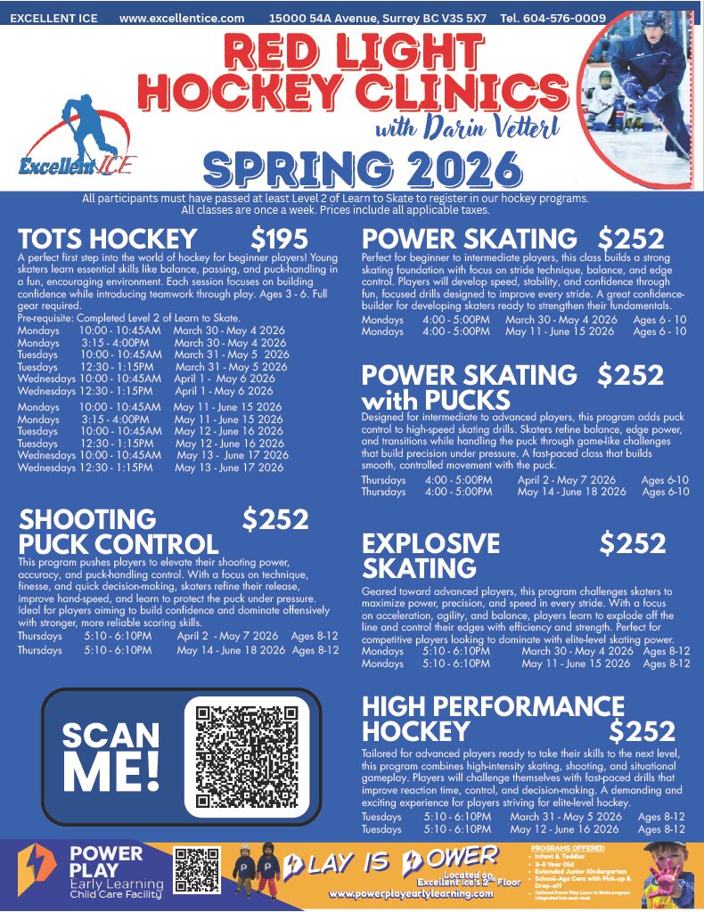 Excellent Ice’s Red Light Hockey Sessions are perfect for players who want extra ice time to sharpen their skills. These sessions offer an environment where kids can practice skating, shooting, and puck control. Whether looking to fine-tune technique or just enjoy more time on the ice, Red Light Hockey gives the freedom to focus on what matters most—the game. Reserve your spot online or call us today.