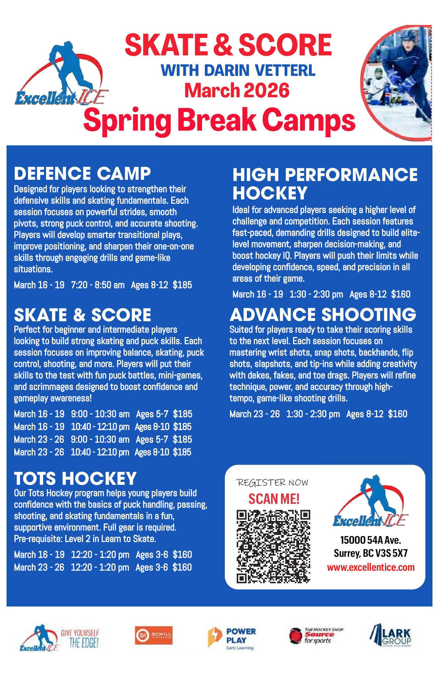 Looking to boost your skating and puck skills this holiday season? Our Skate & Score Camp is designed for young hockey players who want to improve balance, skating technique, puck control, shooting, and overall confidence on the ice. Each session combines skill-building drills with exciting puck battles, mini-games, and scrimmages to make learning fun and engaging.