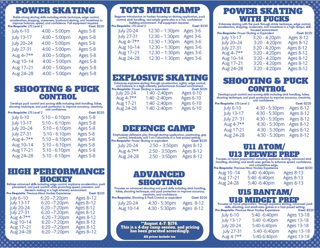Focuses on well-rounded skill development including power skating, stick handling, shooting, small-area games, and performance drills in a high energy, fast-paced environment. 3 hours of ice time daily. Please bring a small snack each day. Click here to register.